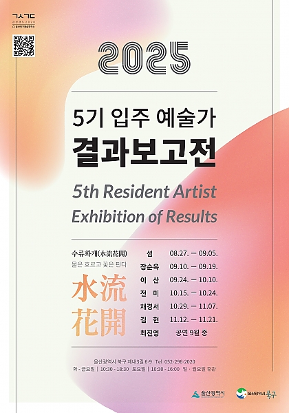 전체 공연 종류 전체 공연 전시 교육·체험 행사·축제 기타 구·군 선택 전체 남구 중구 동구 북구 울주군 동 선택 전체 공연 장소 전체 울주문화원서울주문화센터불고기팜농어촌테마공원갤러리카페래예술가의 집광주광역시 일대지앤 갤러리부산대학교 예술관 무용홀부산국제연극제범서생활체육공원갤러리미지 기간 검색 검색어 행사명 장소명 검색 전체 중구 남구 동구 북구 울주군 전체 2,187 건 / 현재 1 페이지 13일 후 종료 이현주 개인전 기간 2025-10-01 ~ 2025-10-18 장소 갤러리 월 문의 miso68@naver.com, 010-3604-7045, 010-5030-0372 5달 후 종료 얼굴 쓱, 마음 톡 기간 2025-09-25 ~ 2026-03-08 장소 울산시립미술관 문의 052-229-8443 15일 후 종료 명덕생활문화센터 주민 참여 콘텐츠 공모전 「동백꽃 컬렉션」 기간 2025-09-30 ~ 2025-10-20 장소 명덕생활문화센터 문의 052-236-6388 9일 후 종료 쇳내와 파람 기간 2025-09-30 ~ 2025-10-14 장소 북구예술창작소 소금나루2014 문의 bukguart@naver.com, 052-289-8169 2일 후 종료 추석 문화행사 기간 2025-10-05 ~ 2025-10-07 장소 울산박물관 문의 052-229-4736 15일 후 종료 2026년 상반기 전시 대관 공모 기간 2025-10-01 ~ 2025-10-20 장소 슬도아트 문의 seuldoart@naver.com, 052-234-1033 6일 후 종료 1620G USURPER 기간 2025-09-19 ~ 2025-10-11 장소 독립대안문회공간 비모어 문의 052-911-1015 1달 후 종료 감성갱도 레지던시 5기 입주예술가 결과보고전 '수류화개 水流花蓋' 기간 2025-08-27 ~ 2025-11-21 장소 북구예술창작소 감성갱도2020 문의 gsgd2020@hanmail.net, 052-296-2020 1 2 3 4 5 다음 끝