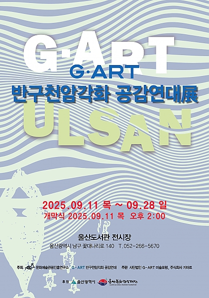 전시 공연 종류 전체 공연 전시 교육·체험 행사·축제 기타 구·군 선택 전체 남구 중구 동구 북구 울주군 동 선택 전체 공연 장소 전체 울주문화원서울주문화센터불고기팜농어촌테마공원갤러리카페래예술가의 집광주광역시 일대지앤 갤러리부산대학교 예술관 무용홀부산국제연극제범서생활체육공원갤러리미지갤러리지앤 기간 검색 검색어 행사명 장소명 검색 전체 중구 남구 동구 북구 울주군 전체 548 건 / 현재 6 페이지 종료 쇳내와 파람 기간 2025-09-30 ~ 2025-10-14 장소 북구예술창작소 소금나루2014 문의 bukguart@naver.com, 052-289-8169 종료 주민전시[다시, 자연으로] 기간 2025-09-16 ~ 2025-10-05 장소 중구생활문화센터 문의 052-290-4843, 052-290-3666 종료 제 32회 울산판화협회전 2025 제6회 울산아시아판화제 기간 2025-10-15 ~ 2025-10-20 장소 울산문화예술회관 전시장 문의 bluesock1@nate.com, 010-2229-0942 종료 제7회 GART반구천암각화공감연대전 기간 2025-09-11 ~ 2025-09-28 장소 울산도서관 문의 artkey0@naver.com, 010-5522-7912 종료 1620G USURPER 기간 2025-09-19 ~ 2025-10-11 장소 독립대안문회공간 비모어 문의 052-911-1015 종료 COSMOS 정미경개인전 기간 2025-09-14 ~ 2025-09-21 장소 갤러리 지앤 문의 dokki0717@hanmail.net, 052-261-7276 종료 OE : HWANG 강 너머, 유적의 숨 기간 2025-09-17 ~ 2025-09-30 장소 창작스튜디오 장생포고래로 131 문의 052-911-1015 종료 2025 장생포문화창고 기획전시 「K-컬처의 힘: 장생포에서 세계로」 기간 2025-09-20 ~ 2025-10-19 장소 장생포문화창고 처음 이전 6 7 8 9 10 다음 끝