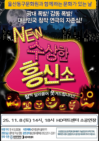 공연 공연 종류 전체 공연 전시 교육·체험 행사·축제 기타 구·군 선택 전체 남구 중구 동구 북구 울주군 동 선택 전체 공연 장소 전체 울주문화원서울주문화센터불고기팜농어촌테마공원갤러리카페래예술가의 집광주광역시 일대지앤 갤러리부산대학교 예술관 무용홀부산국제연극제범서생활체육공원갤러리미지갤러리지앤 기간 검색 검색어 행사명 장소명 검색 전체 중구 남구 동구 북구 울주군 전체 1,243 건 / 현재 1 페이지 2달 후 종료 북구 A/S(Art Service)Center 기간 2025-08-25 ~ 2025-12-25 장소 울산 북구 문화예술회관 문의 052-241-7350 2일 후 종료 브라보! 얼쑤! 뮤지컬 놀이 기간 2025-05-03 ~ 2025-10-25 장소 오영수문학관 문의 misil523@naver.com, 010-3267-3210 1달 후 예정 시립청소년교향악단 제47회 정기연주회 기간 2025-11-30 ~ 2025-11-30 장소 울산문화예술회관 대공연장 문의 052-275-9623 22일 후 예정 백설공주 기간 2025-11-14 ~ 2025-11-23 장소 ARTHALL마당 문의 052-269-8034 1달 후 예정 뉴욕 필하모닉 스트링 콰르텟 내한공연 기간 2025-12-07 ~ 2025-12-07 장소 울산문화예술회관 소공연장 문의 052-226-8296 15일 후 예정 푸른 달 기간 2025-11-07 ~ 2025-11-07 장소 서울주문화센터 문의 010-9008-6614 16일 후 예정 울산동구문화원과 함께하는 문화가 있는 날 - 연극 수상한 흥신소 기간 2025-11-08 ~ 2025-11-08 장소 울산동구문화원 문의 052-251-2261 19일 후 예정 울산 위드 오케스트라 제 5회 정기연주회 기간 2025-11-11 ~ 2025-11-11 장소 울주문화예술회관 문의 hj4511@naver.com, 010-3011-4511 1 2 3 4 5 다음 끝