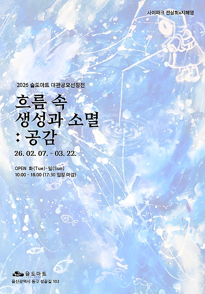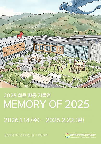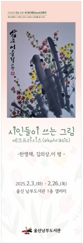 전시 공연 종류 전체 공연 전시 교육·체험 행사·축제 기타 구·군 선택 전체 남구 중구 동구 북구 울주군 동 선택 전체 공연 장소 전체 울주문화원서울주문화센터불고기팜농어촌테마공원갤러리카페래예술가의 집광주광역시 일대지앤 갤러리부산대학교 예술관 무용홀부산국제연극제범서생활체육공원갤러리미지갤러리지앤Fe01 재생복합문화공간 기간 검색 검색어 행사명 장소명 검색 전체 중구 남구 동구 북구 울주군 전체 648 건 / 현재 1 페이지 19일 후 종료 시인들이 쓰는 그림, 『에크프라시스(ekphrasis) 3인전 기간 2026-02-03 ~ 2026-02-26 장소 울산남부도서관 8일 후 종료 두 개의시선, 다른 온도 기간 2026-02-03 ~ 2026-02-15 장소 월플러스 문의 miso68@naver.com, 010-3604-7045 1달 후 종료 사이파크 ⟪흐름 속 생성과 소멸: 공감⟫ 기간 2026-02-07 ~ 2026-03-22 장소 슬도아트 문의 seuldoart@naver.com, 052-234-1033 21일 후 종료 MY little soda pop pop 기간 2026-01-19 ~ 2026-02-28 장소 갤러리 지앤 문의 dokki0717@hanmail.net, 052-261-7276 18일 후 종료 다그닥 다그닥 말 미술관 기간 2026-01-24 ~ 2026-02-25 장소 장생포문화창고 1달 후 종료 미디어아트 - 비비드 판타지 기간 2025-11-21 ~ 2026-03-31 장소 장생포문화창고 15일 후 종료 2025 회관활동기록전 <MEMORY OF 2025> 기간 2026-01-14 ~ 2026-02-22 장소 울산학생교육문화회관 4달 후 종료 안소니 맥콜 : 원뿔을 그리는 선 2.0 기간 2026-02-05 ~ 2026-06-14 장소 울산시립미술관 1 2 3 4 5 다음 끝