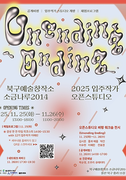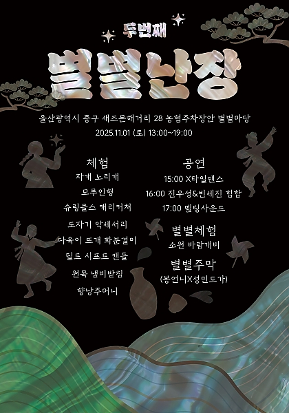 행사·축제 공연 종류 전체 공연 전시 교육·체험 행사·축제 기타 구·군 선택 전체 남구 중구 동구 북구 울주군 동 선택 전체 공연 장소 전체 울주문화원서울주문화센터불고기팜농어촌테마공원갤러리카페래예술가의 집광주광역시 일대지앤 갤러리부산대학교 예술관 무용홀부산국제연극제범서생활체육공원갤러리미지갤러리지앤 기간 검색 검색어 행사명 장소명 검색 전체 중구 남구 동구 북구 울주군 전체 108 건 / 현재 1 페이지 종료 장생포 비밀수사단 : 사라진 호작도의 비밀 기간 2025-12-06 ~ 2025-12-06 장소 장생포 아트스테이 문의 052-276-9672, 052-276-9674 종료 [Unending ending] 2025 오픈스튜디오 기간 2025-11-25 ~ 2025-11-26 장소 북구예술창작소 소금나루2014 문의 bukguart@naver.com, 052-289-8169 오늘 종료 2025 울산문화박람회 ULSAN CULTURE EXPO 기간 2025-12-04 ~ 2025-12-07 장소 유에코(울산전시컨벤션센터) 종료 2025년 울산 문학 아카이브 [북콘서트] 기간 2025-11-28 ~ 2025-11-28 장소 울산도서관 문의 052-255-1913 종료 개관 1주년 기념 'POP UP! GROW UP!' 기간 2025-11-15 ~ 2025-11-15 장소 이화정청소년창작센터 문의 052-700-1318 종료 도시 다시 보기 프로젝트 <도시기록소 : 타임멋씬> 기간 2025-11-05 ~ 2025-11-26 장소 성남프라자 문의 project_jpa@naver.com, 010-2420-7753 종료 별별난장 기간 2025-11-01 ~ 2025-11-01 장소 이팔청춘마을공방별별마당 문의 050713022886 종료 울산세계미래산업박람회 기간 2025-11-12 ~ 2025-11-14 장소 울산전시컨벤션센터 문의 2025wave@naver.com, 070-4365-8370 1 2 3 4 5 다음 끝