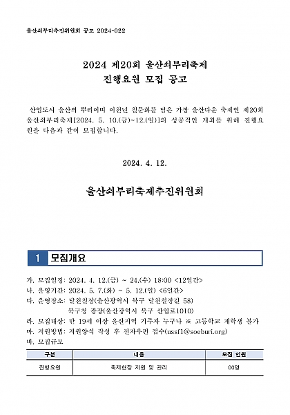 - 45 2024 제20회 울산쇠부리축제 진행요원 모집 공고