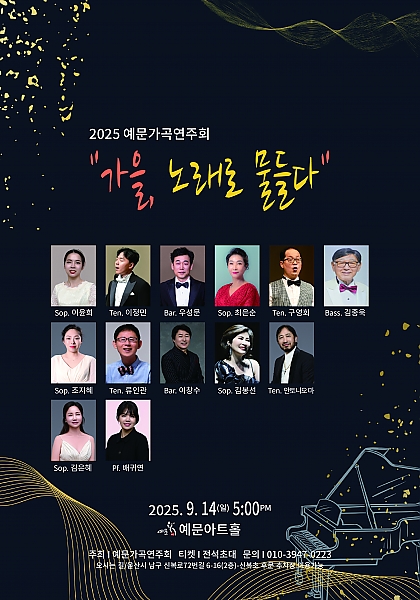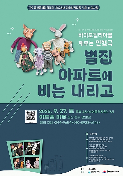공연 공연 종류 전체 공연 전시 교육·체험 행사·축제 기타 구·군 선택 전체 남구 중구 동구 북구 울주군 동 선택 전체 공연 장소 전체 울주문화원서울주문화센터불고기팜농어촌테마공원갤러리카페래예술가의 집광주광역시 일대지앤 갤러리부산대학교 예술관 무용홀부산국제연극제범서생활체육공원갤러리미지갤러리지앤 기간 검색 검색어 행사명 장소명 검색 전체 중구 남구 동구 북구 울주군 전체 1,296 건 / 현재 14 페이지 종료 바이오필리아를 깨우는 인형극 <벌집 아파트에 비는 내리고> 인형극 공연 기간 2025-09-27 ~ 2025-09-27 장소 아트홀 마당 문의 pum0501@hanmail.net, 010-8928-6148 종료 판타지 가족오페라 물의 아이 기간 2025-10-25 ~ 2025-10-25 장소 중구문화의전당 문의 052-290-4000, 052-290-4273 종료 연극 기간 2025-09-14 ~ 2025-09-14 장소 소극장푸른가시 문의 010-3882-7516 종료 연극 수상한 흥신소 기간 2025-10-30 ~ 2025-11-13 장소 HD아트센터 문의 1522-3331 종료 코믹 마샬아츠 퍼포먼스 <점프> 기간 2025-11-13 ~ 2025-11-15 장소 HD아트센터 문의 1522-3331 종료 소누스 앙상블(Sonus Ensemble) “실내악, 낭만을 품다” 기간 2025-10-11 ~ 2025-10-11 장소 예문아트홀 문의 010-3946-0223 종료 예문가곡연주회 “가을, 노래로 물들다” 기간 2025-09-14 ~ 2025-09-14 장소 예문아트홀 문의 010-3946-0223 종료 소프라노 성은혜의 두 번째 이야기 <사랑 그리고 꿈> 기간 2025-10-11 ~ 2025-10-11 장소 중구문화의전당 문의 010-7726-1918 처음 이전 11 12 13 14 15 다음 끝