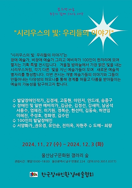 전시 공연 종류 전체 공연 전시 교육·체험 행사·축제 기타 구·군 선택 전체 남구 중구 동구 북구 울주군 동 선택 전체 공연 장소 전체 울주문화원서울주문화센터불고기팜농어촌테마공원갤러리카페래예술가의 집광주광역시 일대지앤 갤러리부산대학교 예술관 무용홀부산국제연극제범서생활체육공원갤러리미지 기간 검색 검색어 행사명 장소명 검색 전체 중구 남구 동구 북구 울주군 전체 529 건 / 현재 23 페이지 종료 시리우스의 빛:우리들의 이야기 기간 2024-11-27 ~ 2024-12-03 장소 울산남구문화원 갤러리 숲 문의 010-3051-0377 종료 주름 사이 귀를 기울이네 기간 2024-11-29 ~ 2024-12-10 장소 북구예술창작소 소금나루2014 문의 bukguart@naver.com, 052-289-8169 종료 <디지털과 환경> 사진심층연구회(사심연) 기간 2024-11-25 ~ 2024-12-01 장소 갤러리큐 문의 mocca12@kakao.com, 052-261-9101 종료 윤옥례개인전 기간 2024-11-19 ~ 2024-11-28 장소 아트스페이스그루 문의 artspace_g-ru@naver.com, 010-5502-9345, 010-5127-1701 종료 뮤즈세움 연말기획 세움전 기간 2024-11-21 ~ 2024-12-06 장소 뮤즈세움갤러리 문의 musesseum@gmail.com 종료 메세지로 만나는 예술 IN ULSAN 기간 2024-11-20 ~ 2024-12-20 장소 1차: 프림 , 2차; 울산학생교육문화회관 문의 yab4575@naver.com, 010-2674-4575 종료 <ENTROPY VOL 2> 2024 송화영 일곱번째 개인전 기간 2024-11-17 ~ 2024-11-24 장소 갤러리큐 문의 mocca12@kakao.com, 052-261-9101 종료 '사람과 풍경을 만나는 6개의 이야기 여행' 기간 2024-11-16 ~ 2024-12-22 장소 문화공장방어진 문의 052-234-1033 처음 이전 21 22 23 24 25 다음 끝