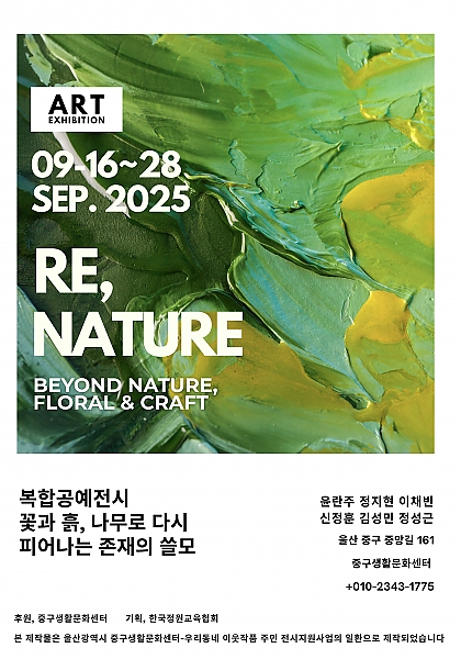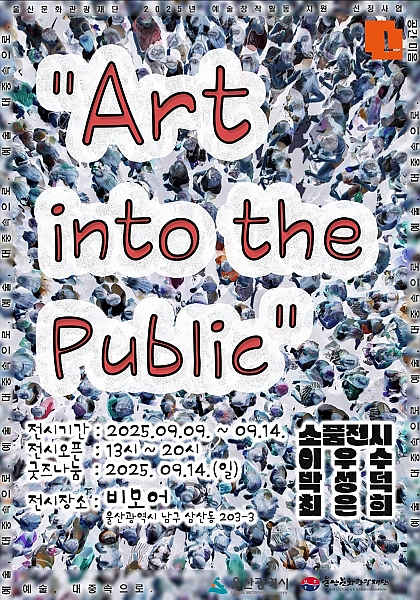 전시 공연 종류 전체 공연 전시 교육·체험 행사·축제 기타 구·군 선택 전체 남구 중구 동구 북구 울주군 동 선택 전체 공연 장소 전체 울주문화원서울주문화센터불고기팜농어촌테마공원갤러리카페래예술가의 집광주광역시 일대지앤 갤러리부산대학교 예술관 무용홀부산국제연극제범서생활체육공원갤러리미지 기간 검색 검색어 행사명 장소명 검색 전체 중구 남구 동구 북구 울주군 전체 529 건 / 현재 4 페이지 종료 주민전시[다시, 자연으로] 기간 2025-09-16 ~ 2025-10-05 장소 중구생활문화센터 문의 052-290-4843, 052-290-3666 종료 제7회 GART반구천암각화공감연대전 기간 2025-09-11 ~ 2025-09-28 장소 울산도서관 문의 artkey0@naver.com, 010-5522-7912 종료 COSMOS 정미경개인전 기간 2025-09-14 ~ 2025-09-21 장소 갤러리 지앤 문의 dokki0717@hanmail.net, 052-261-7276 종료 OE : HWANG 강 너머, 유적의 숨 기간 2025-09-17 ~ 2025-09-30 장소 창작스튜디오 장생포고래로 131 문의 052-911-1015 종료 씨앗의 목소리 기간 2025-09-19 ~ 2025-10-02 장소 뮤즈세움갤러리 문의 musesseum@gmail.com 종료 Layers 기간 2025-09-17 ~ 2025-09-25 장소 북구예술창작소 소금나루2014 문의 bukguart@naver.com, 052-289-8169 종료 Art into the Public 기간 2025-09-09 ~ 2025-09-14 장소 독립대안문회공간 비모어 문의 052-911-1015 종료 <방향> 김옥희 개인전 기간 2025-09-24 ~ 2025-09-30 장소 울산남구문화원 갤러리 숲 1 2 3 4 5 다음 끝
