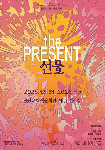 전시 공연 종류 전체 공연 전시 교육·체험 행사·축제 기타 구·군 선택 전체 남구 중구 동구 북구 울주군 동 선택 전체 공연 장소 전체 울주문화원서울주문화센터불고기팜농어촌테마공원갤러리카페래예술가의 집광주광역시 일대지앤 갤러리부산대학교 예술관 무용홀부산국제연극제범서생활체육공원갤러리미지갤러리지앤Fe01 재생복합문화공간 기간 검색 검색어 행사명 장소명 검색 전체 중구 남구 동구 북구 울주군 전체 648 건 / 현재 5 페이지 종료 울산여행스케치 <만남의 선, 여행의 색> 기간 2025-12-24 ~ 2025-12-28 장소 아트스페이스그루 문의 artspace_g-ru@naver.com, 010-5127-1701 종료 여섯 번째 감성전: 선물 기간 2025-12-31 ~ 2025-01-05 장소 울산문화예술회관 전시장 종료 김윤아 개인전 기간 2025-12-30 ~ 2026-01-10 장소 월플러스 문의 miso68@naver.com, 010-3604-7045 종료 이지연의 감각의 본질 기간 2025-12-23 ~ 2026-01-11 장소 갤러리 지앤 문의 dokki0717@hanmail.net, 052-261-7276 종료 별주부전-바다속이야기 기간 2025-12-20 ~ 2026-02-01 장소 슬도아트 종료 빛의 순간들 기간 2025-12-23 ~ 2026-01-10 장소 뮤즈세움갤러리 문의 musesseum@gmail.com 종료 <색깔로 그린 동화> 그림 그리는 아이 친구들 기간 2026-01-19 ~ 2026-01-24 장소 갤러리큐 문의 mocca12@kakao.com, 052-261-9101 종료 <MOMENTO MORY> 김미정 개인전 기간 2026-01-05 ~ 2026-01-11 장소 갤러리큐 문의 mocca12@kakao.com, 052-261-9101 1 2 3 4 5 다음 끝