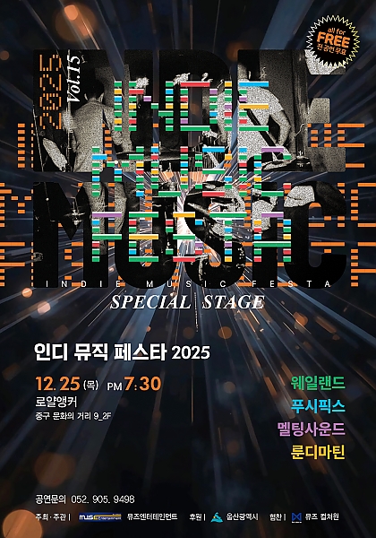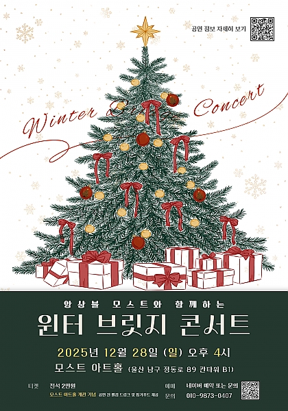 공연 공연 종류 전체 공연 전시 교육·체험 행사·축제 기타 구·군 선택 전체 남구 중구 동구 북구 울주군 동 선택 전체 공연 장소 전체 울주문화원서울주문화센터불고기팜농어촌테마공원갤러리카페래예술가의 집광주광역시 일대지앤 갤러리부산대학교 예술관 무용홀부산국제연극제범서생활체육공원갤러리미지갤러리지앤Fe01 재생복합문화공간 기간 검색 검색어 행사명 장소명 검색 전체 중구 남구 동구 북구 울주군 전체 1,354 건 / 현재 6 페이지 종료 인디 뮤직 페스타 2025 기간 2025-12-25 ~ 2025-12-25 장소 울산동구문화원 문의 jcom21@hanmail.net, 052-905-9498 종료 앙상블 모스트와 함께하는 '윈터 브릿지 콘서트' 기간 2025-12-28 ~ 2025-12-28 장소 모스트 아트홀 문의 ensemblemoct@gmail.com, 010-9873-0407 종료 설여 기간 2025-12-22 ~ 2025-12-22 장소 아트홀 마당 문의 010-3397-5164 종료 환희의 작곡노트 III 기간 2025-12-15 ~ 2025-12-15 장소 예문아트홀 문의 010-3947-0223 종료 추동엽창작음악회 기간 2025-12-02 ~ 2025-12-02 장소 아트홀 마당 문의 72ggappi@hanmail.net, 010-2633-5756 종료 AI 정원의소리 : 쇼케이스 기간 2025-12-17 ~ 2025-12-17 장소 아트홀 마당 문의 010-8828-0456 종료 가족뮤지컬 피노키오 기간 2026-01-24 ~ 2026-01-24 장소 울주문화예술회관 문의 070-7349-7549 종료 가족뮤지컬 호두까기인형 기간 2025-12-13 ~ 2025-12-13 장소 울주문화예술회관 문의 070-7349-7549 처음 이전 6 7 8 9 10 다음 끝
