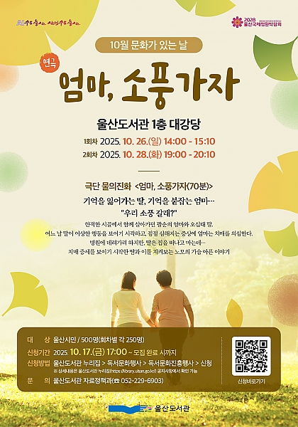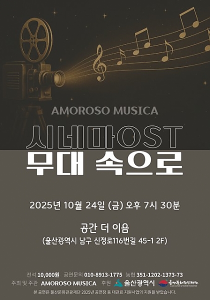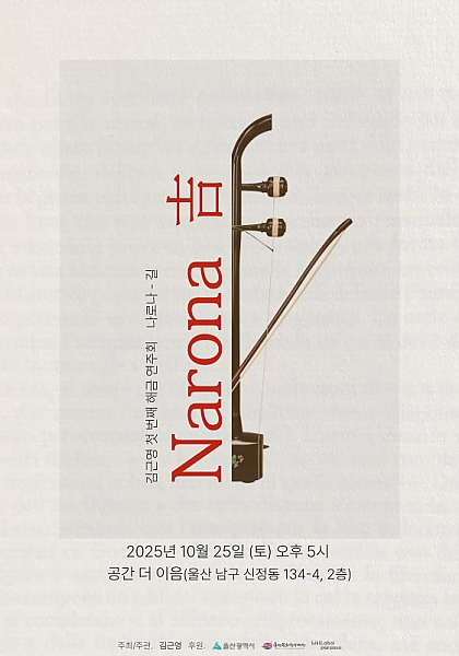 공연 공연 종류 전체 공연 전시 교육·체험 행사·축제 기타 구·군 선택 전체 남구 중구 동구 북구 울주군 동 선택 전체 공연 장소 전체 울주문화원서울주문화센터불고기팜농어촌테마공원갤러리카페래예술가의 집광주광역시 일대지앤 갤러리부산대학교 예술관 무용홀부산국제연극제범서생활체육공원갤러리미지갤러리지앤 기간 검색 검색어 행사명 장소명 검색 전체 중구 남구 동구 북구 울주군 전체 1,296 건 / 현재 7 페이지 종료 뮤지컬 모노드라마 〈벽속의 요정〉 기간 2025-11-14 ~ 2025-11-14 장소 중구문화의전당 문의 052-290-4000, 052-290-4273 종료 윤서현 가야금 독주회<鉉,絃> 기간 2025-11-08 ~ 2025-11-08 장소 아트홀 마당 종료 시네마OST 무대 속으로 기간 2025-10-24 ~ 2025-10-24 장소 공간더이음 문의 010-8913-1775 종료 제13회 고은빛피아노학회 정기연주회 기간 2025-11-30 ~ 2025-11-30 장소 예문아트홀 문의 010-8868-0818 종료 네 손이 들려주는 음악의 시간 여행 – 울담앙상블 기간 2025-11-23 ~ 2025-11-23 장소 예문아트홀 문의 010-3946-0223 종료 전예원가야금독주회 창작음악프로젝트Ⅰ 예쁘고 원없이 기간 2025-11-22 ~ 2025-11-22 장소 울주문화예술회관 문의 010-3060-4211 종료 김근영 첫 번째 해금연주회 나로나-길 기간 2025-10-25 ~ 2025-10-25 장소 공간더이음 종료 울산도서관 10월 문화가 있는 날, 연극 <엄마, 소풍가자> 기간 2025-10-28 ~ 2025-10-28 장소 울산도서관 처음 이전 6 7 8 9 10 다음 끝