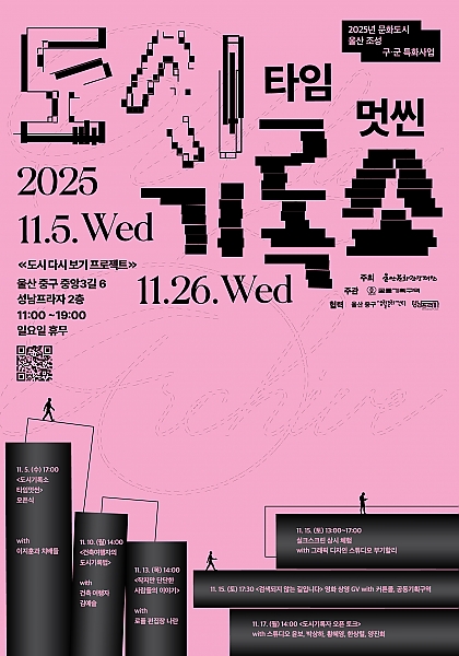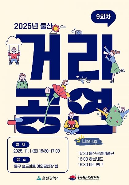 행사·축제 공연 종류 전체 공연 전시 교육·체험 행사·축제 기타 구·군 선택 전체 남구 중구 동구 북구 울주군 동 선택 전체 공연 장소 전체 울주문화원서울주문화센터불고기팜농어촌테마공원갤러리카페래예술가의 집광주광역시 일대지앤 갤러리부산대학교 예술관 무용홀부산국제연극제범서생활체육공원갤러리미지갤러리지앤 기간 검색 검색어 행사명 장소명 검색 전체 중구 남구 동구 북구 울주군 전체 103 건 / 현재 1 페이지 4일 후 예정 도시 다시 보기 프로젝트 <도시기록소 : 타임멋씬> 기간 2025-11-05 ~ 2025-11-26 장소 성남프라자 문의 project_jpa@naver.com, 010-2420-7753 11일 후 예정 울산세계미래산업박람회 기간 2025-11-12 ~ 2025-11-14 장소 울산전시컨벤션센터 문의 2025wave@naver.com, 070-4365-8370 7일 후 예정 2025년 울산거리공연 10회차 기간 2025-11-08 ~ 2025-11-08 장소 현대백화점 울산점 동구 문의 052-255-1911 13일 후 예정 「인문학 콘서트」 김겨울 작가와의 만남 기간 2025-11-14 ~ 2025-11-14 장소 신복도서관 문의 052-226-2362 오늘 종료 별별난장 기간 2025-11-01 ~ 2025-11-01 장소 이팔청춘마을공방별별마당 문의 050713022886 종료 2025 울산에이팜 기간 2025-10-25 ~ 2025-10-26 장소 태화강국가정원 왕버들마당 문의 jsy7622@uctf.or.kr, 052-255-1945, 052-255-1946 오늘 종료 2025년 울산거리공연 9회차 기간 2025-11-01 ~ 2025-11-01 장소 슬도아트 문의 052-255-1911 종료 제3회 탄소중립 환경예술제 <바다쓰기> 기간 2025-10-25 ~ 2025-10-25 장소 FE갤러리(FE01) 문의 fe01space@naver.com, 052-237-0102 1 2 3 4 5 다음 끝