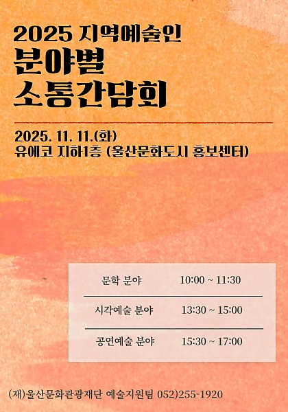 기타 공연 종류 전체 공연 전시 교육·체험 행사·축제 기타 구·군 선택 전체 남구 중구 동구 북구 울주군 동 선택 전체 공연 장소 전체 울주문화원서울주문화센터불고기팜농어촌테마공원갤러리카페래예술가의 집광주광역시 일대지앤 갤러리부산대학교 예술관 무용홀부산국제연극제범서생활체육공원갤러리미지갤러리지앤 기간 검색 검색어 행사명 장소명 검색 전체 중구 남구 동구 북구 울주군 전체 44 건 / 현재 1 페이지 종료 2025 제3회 울산 생태관광 포럼 [ULSEF 2025] 안내 기간 2025-12-02 ~ 2025-12-03 장소 유에코(울산전시컨벤션센터) 종료 2025 지역예술인 분야별 소통간담회 기간 2025-11-11 ~ 2025-11-11 장소 유에코(UECO) 문의 052-255-1920 종료 2025년 북페스티벌 최태성작가 초청 특강 기간 2025-11-19 ~ 2025-11-19 장소 울산광역시청 문의 010-9669-4243 종료 카테고리화된 매체의 탈매체적 실천 기간 2025-10-31 ~ 2025-10-31 장소 N스튜디오 문의 010-9376-4993, 010-3588-0813 종료 EAST COAST DREAM (동해의 꿈) 기간 2025-10-11 ~ 2025-10-12 장소 플러그인 문의 010-5753-5957 종료 명덕생활문화센터 주민 참여 콘텐츠 공모전 「동백꽃 컬렉션」 기간 2025-09-30 ~ 2025-10-20 장소 명덕생활문화센터 문의 052-236-6388 종료 2026년 상반기 전시 대관 공모 기간 2025-10-01 ~ 2025-10-20 장소 슬도아트 문의 seuldoart@naver.com, 052-234-1033 종료 영화< 마싼자에서 온 편지> 앵콜상영(무료관람) 기간 2025-09-27 ~ 2025-09-27 장소 CK아트홀 문의 010-6331-7663 1 2 3 4 5 다음 끝